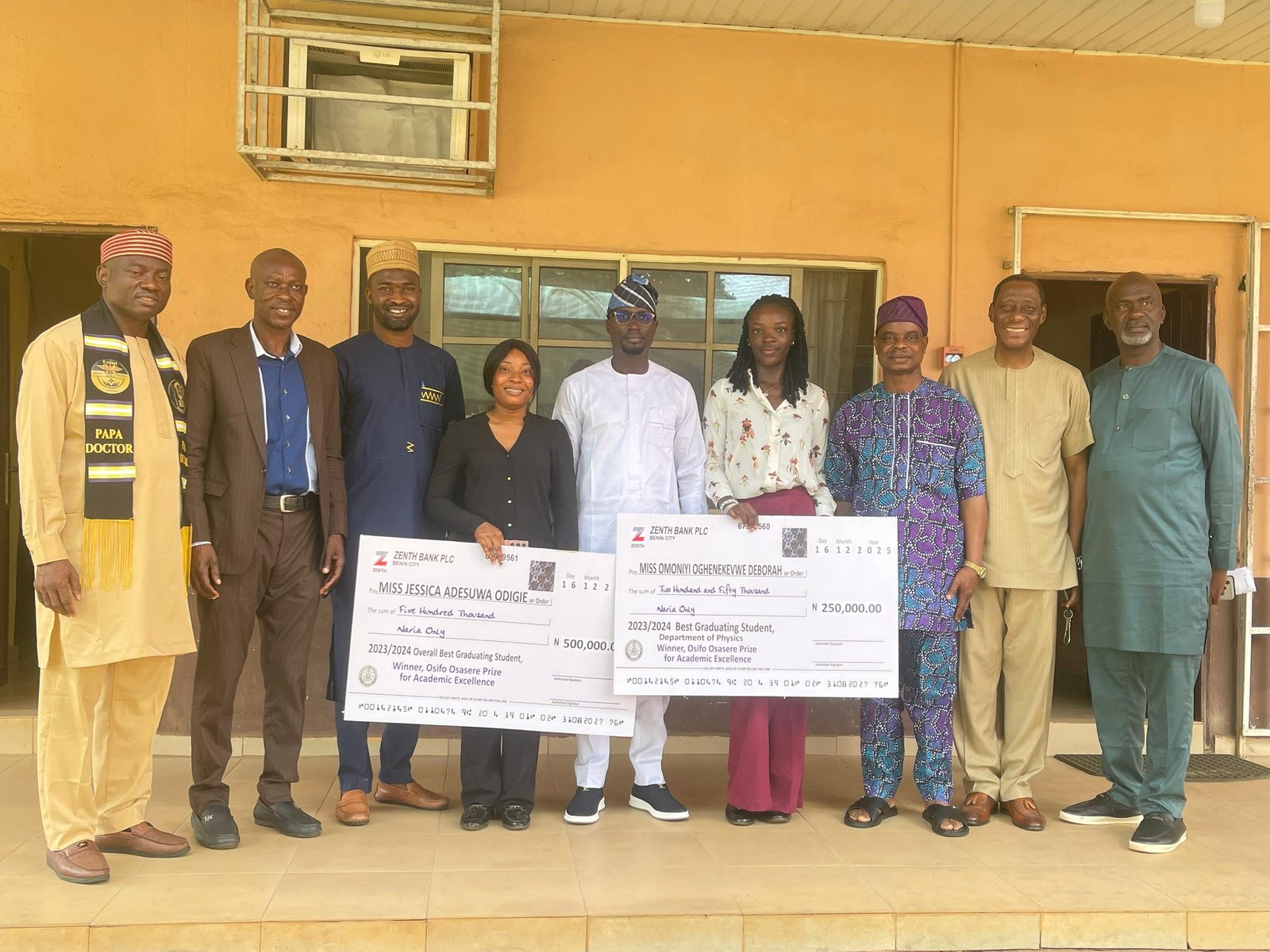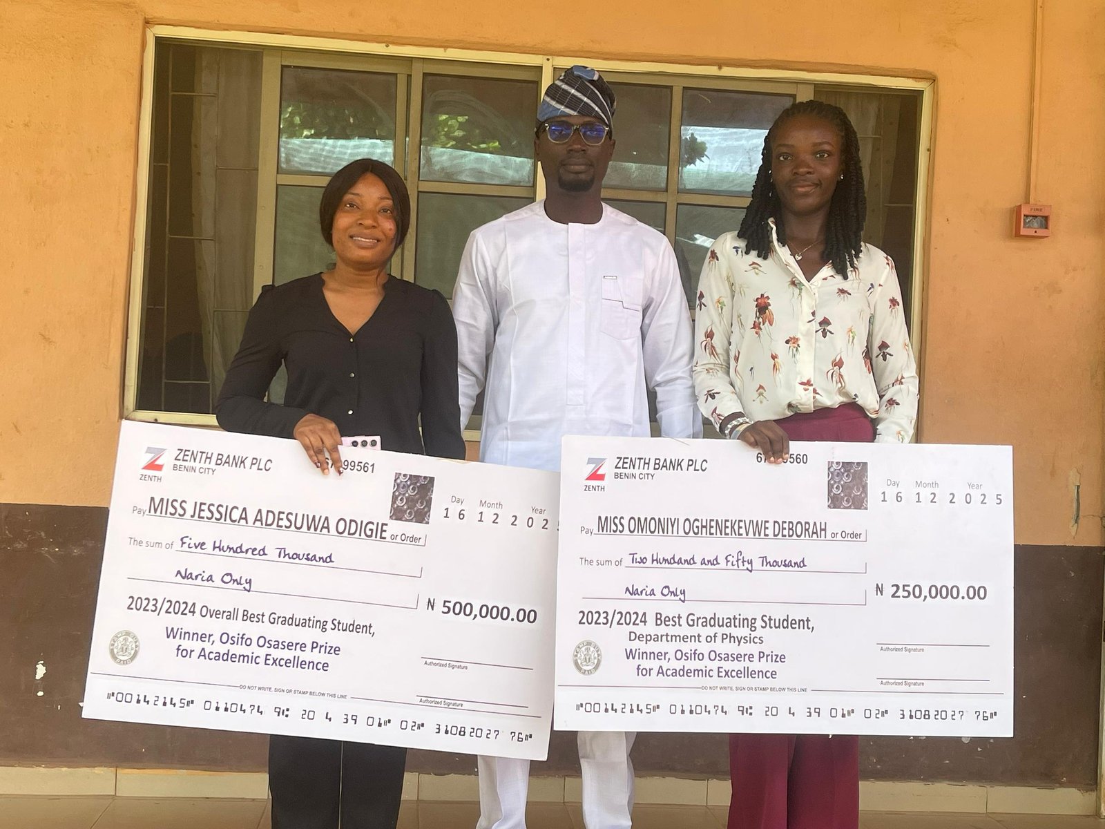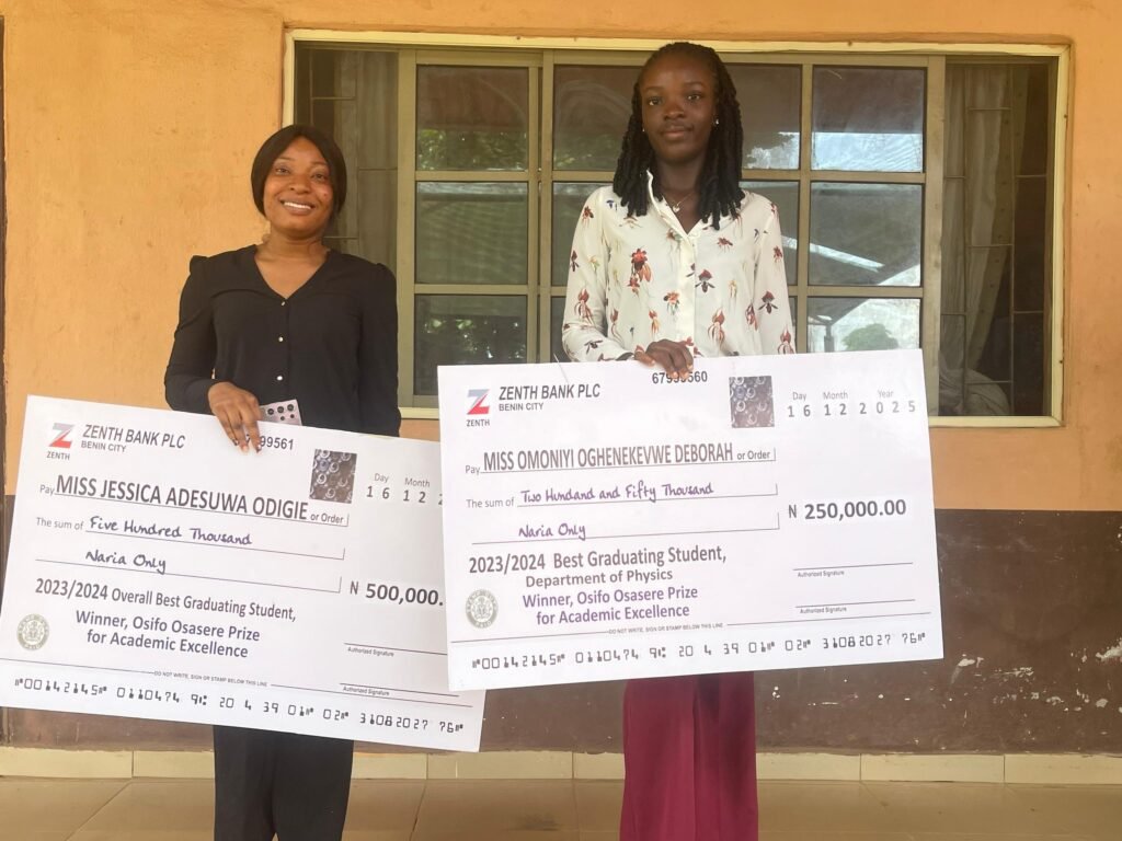 The award presentation ceremony took place on Tuesday, December 16, 2025, at the institution’s Students’ Affairs Division. Miss Jessica, a graduate of the Faculty of Physical Sciences, received a dual honour for emerging as the Best Graduating Student in the Convener’s former faculty and as the Overall Best Graduating Student of the University. Miss Deborah was similarly honoured as the Best Graduating Student in the Department of Physics under the same faculty.
